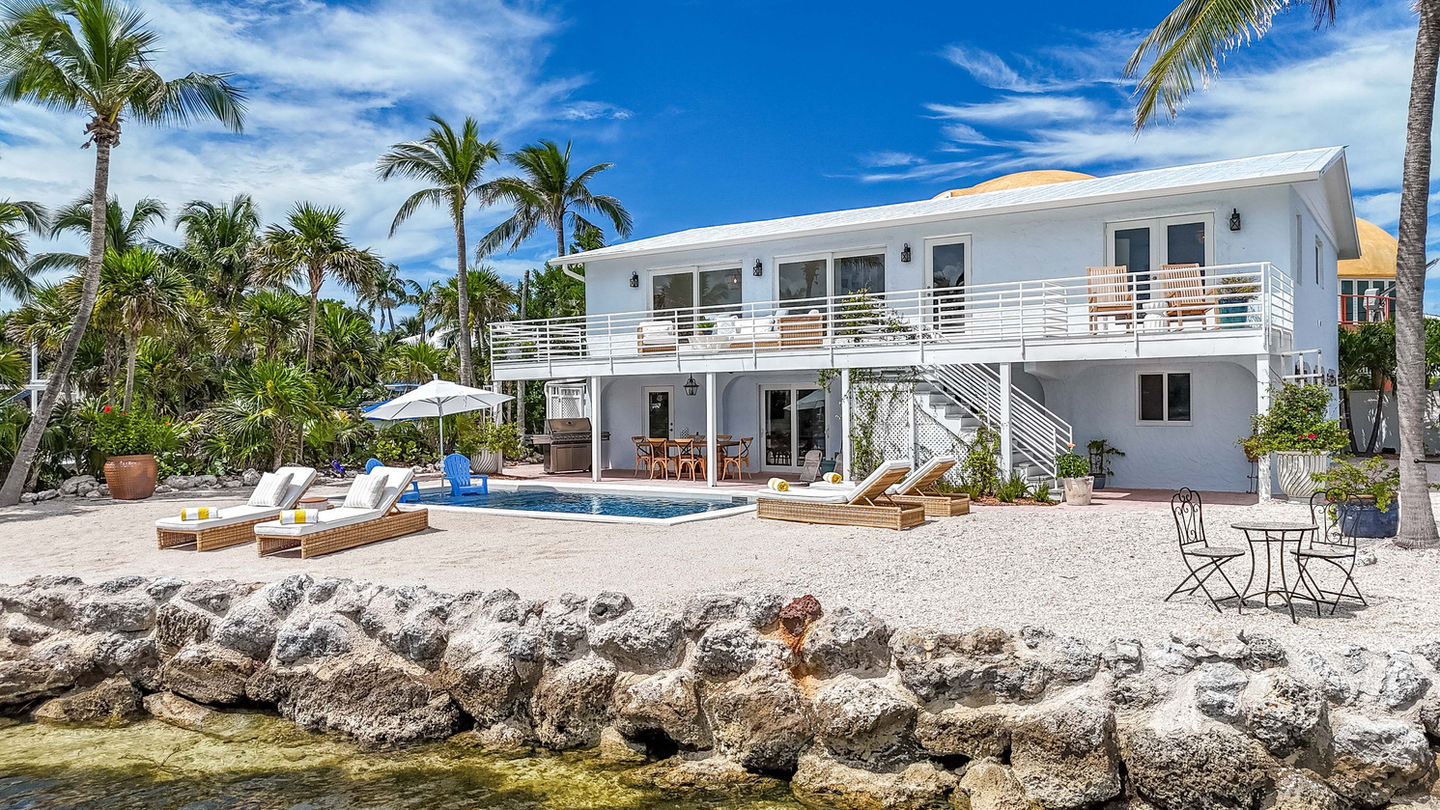 Enjoy the unobstructed 270-degree ocean view in this newly renovated beachfront residence. Located in the most exclusive part of Cudjoe Gardens, this 2- story house is surrounded by water on three sides. Three bedrooms and two bathrooms are impressively decorated in a soft coastal palette and are located on the second main living floor. SeparateThe amble of natural light emphasizes the open and easy-flowing design of the main floor. The well-equipped chef's kitchen has top-of-the-line appliances and is a perfect retreat for culinary-inspired guests. Highlighted by the walls of glass doors, the Friendly floorplan combines the living room and dining room and opens to the oceanfront terrace. The vaulted ceiling adds great drama to the space. The light and airy Master Suite features a King Bed, a private Master Bathroom with a stand-up shower, and a large walk-in closet. The guest wing offers generously scaled two bedrooms and a shared bathroom. The downstairs Guest Quarter enclosure has an additional private queen bedroom, rec room, TV area, a wet bar, and full bathroom. The private pool is nestled on a sandy beach and surrounded by meticulously maintained grounds. This house is truly Paradise Found!